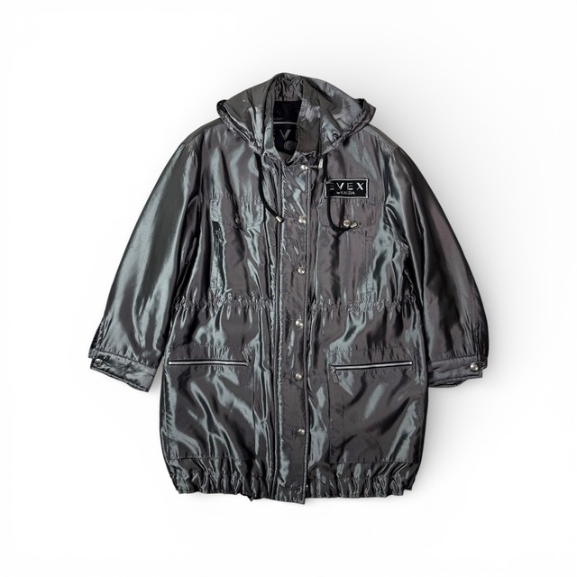 EVEX by KRIZIAから。 一見するとアウトドアやミリタリーの延長線上、 もしくはベンチコート。 にしては綺麗すぎます。 強く反射するわけではなく、 鈍く、湿度を含んだようなグレーが輝きます。 フードはジップで着脱可能。 外せば一気に匿名性が高まり、 コートのような静かな輪郭に。 ウエストと裾にはドローコードが入り、 着丈やボリュームを微調整できる仕様。 EVEXは KRIZIA のカジュアルラインとして 展開されていましたが、 このアイテムはロゴや文脈以上の完成度。 スタイリング次第で モードにも、無機質な日常着にも振れる柔軟さ。 made in Malaysia material 表 acetate 100% 裏 polyester 100% 中綿 polyester 100% 肩幅 50cm 身幅 57cm 袖丈 55cm 着丈 64cm condition 8/10