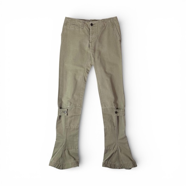 2000年代後半のミハラヤスヒロから。 ベージュのカーゴパンツですが、田舎すぎない このデザイナーらしい個体のパンツです。 細身で少し長いレングスから、ボタンで開閉できるフレア。 その上にはそれをもっと強調できる、アジャストできるボタン。 少し硬いコットンの生地もありますが、 早いテックウェアというよりかは、 佇むような遅めのデザイナーウェアです。 少しいなたいトップスと合わせても、田舎的にならなすぎず、近未来感のある服と合わせても面白いです。 made in Japan material cotton100% ウエスト 38cm 股上 25cm 股下 80cm 裾幅 21cm〜 condition 6/10