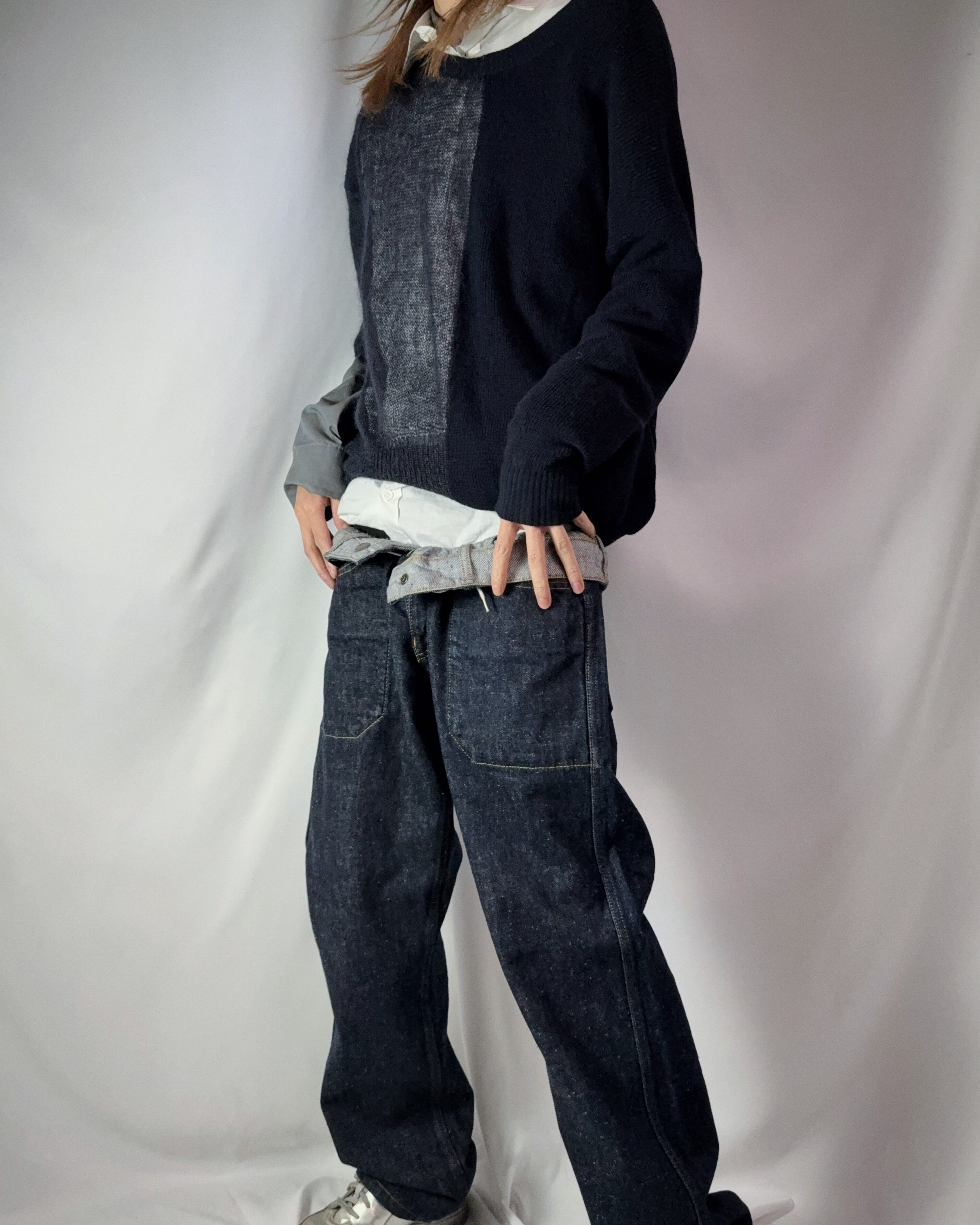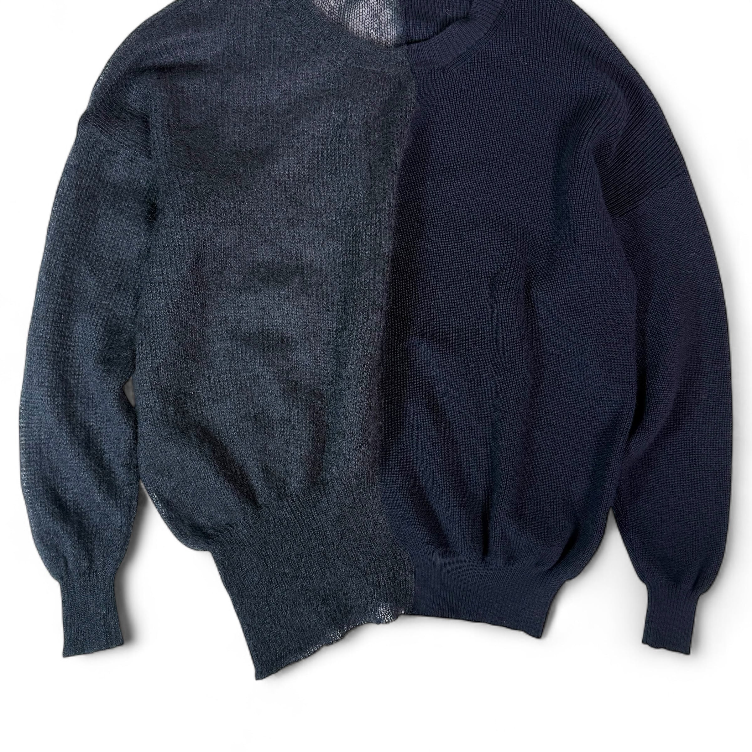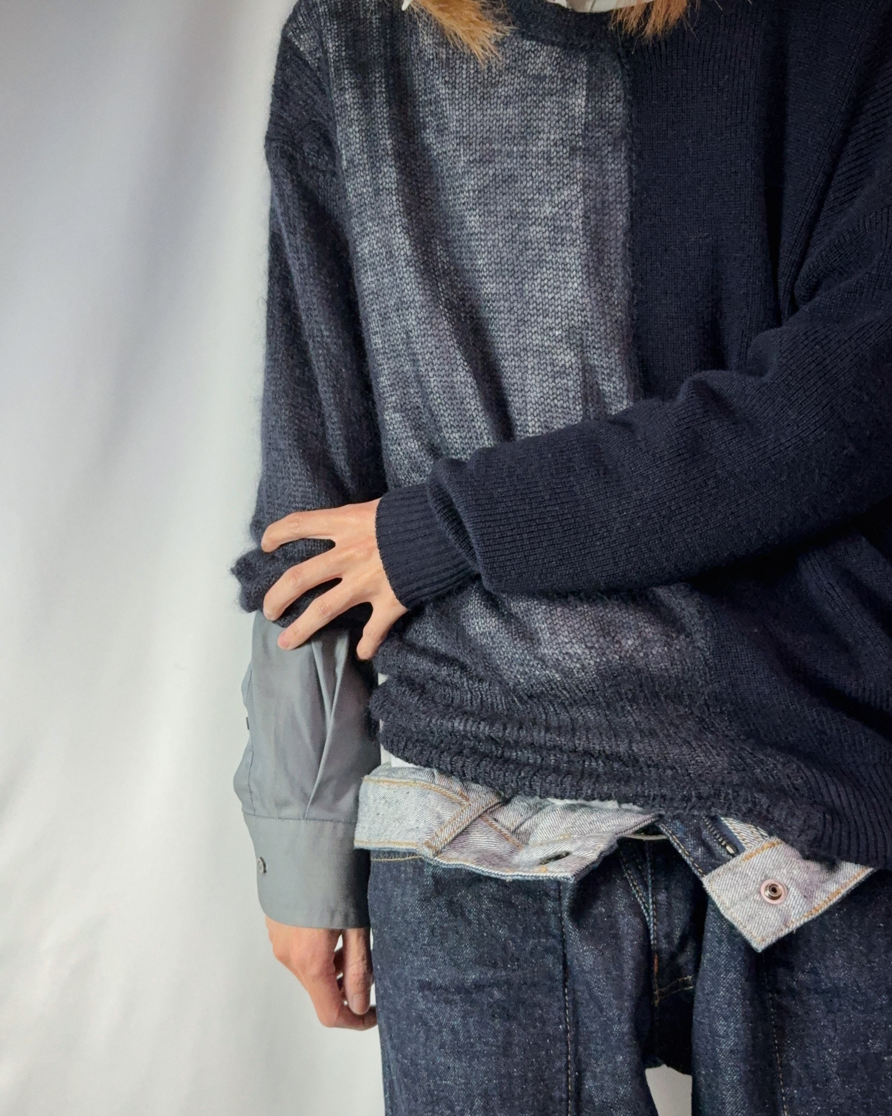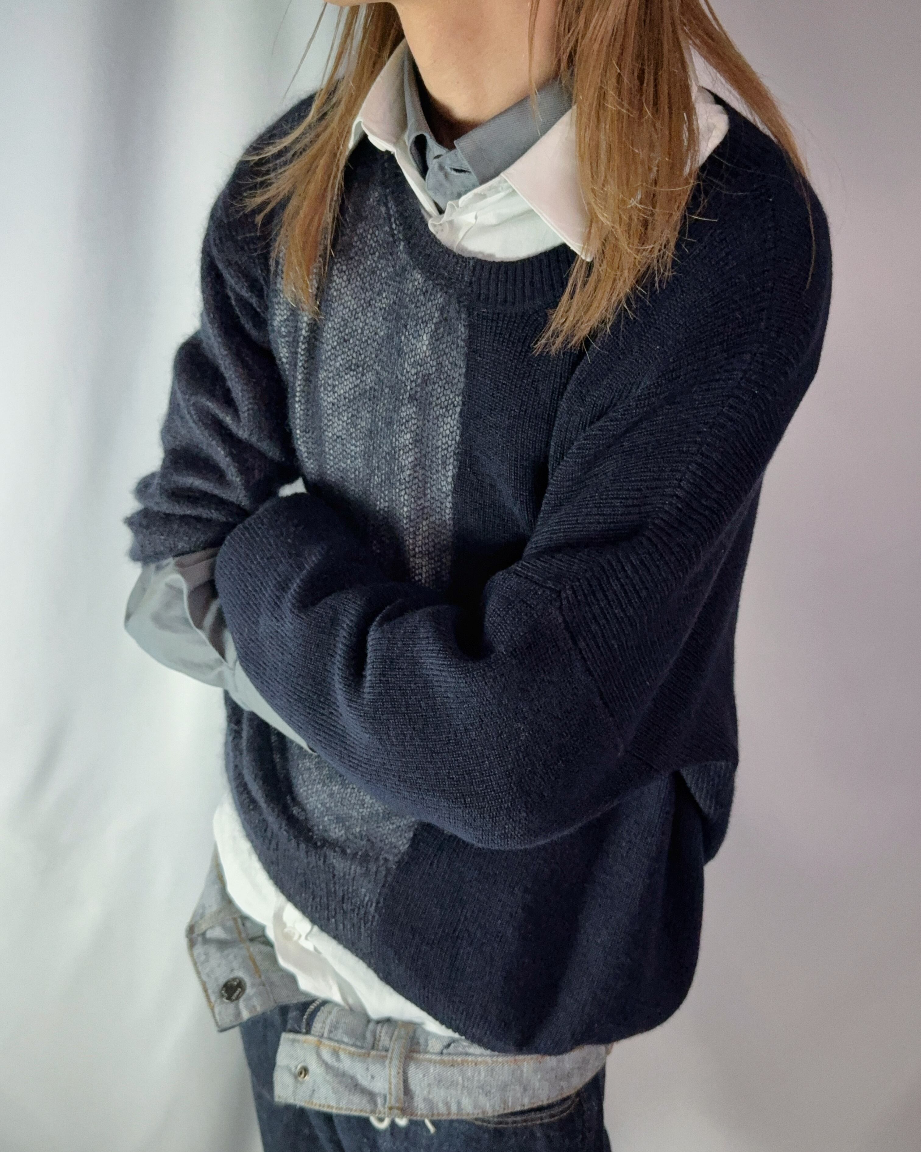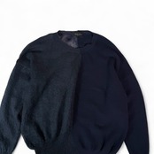 身半分で、編み方の違うニット同士の切り替え。