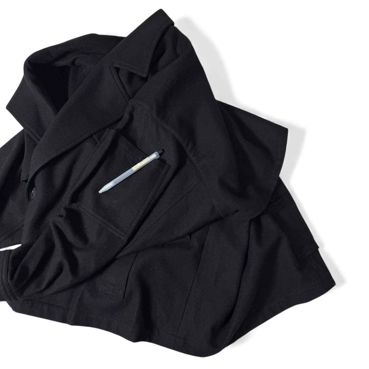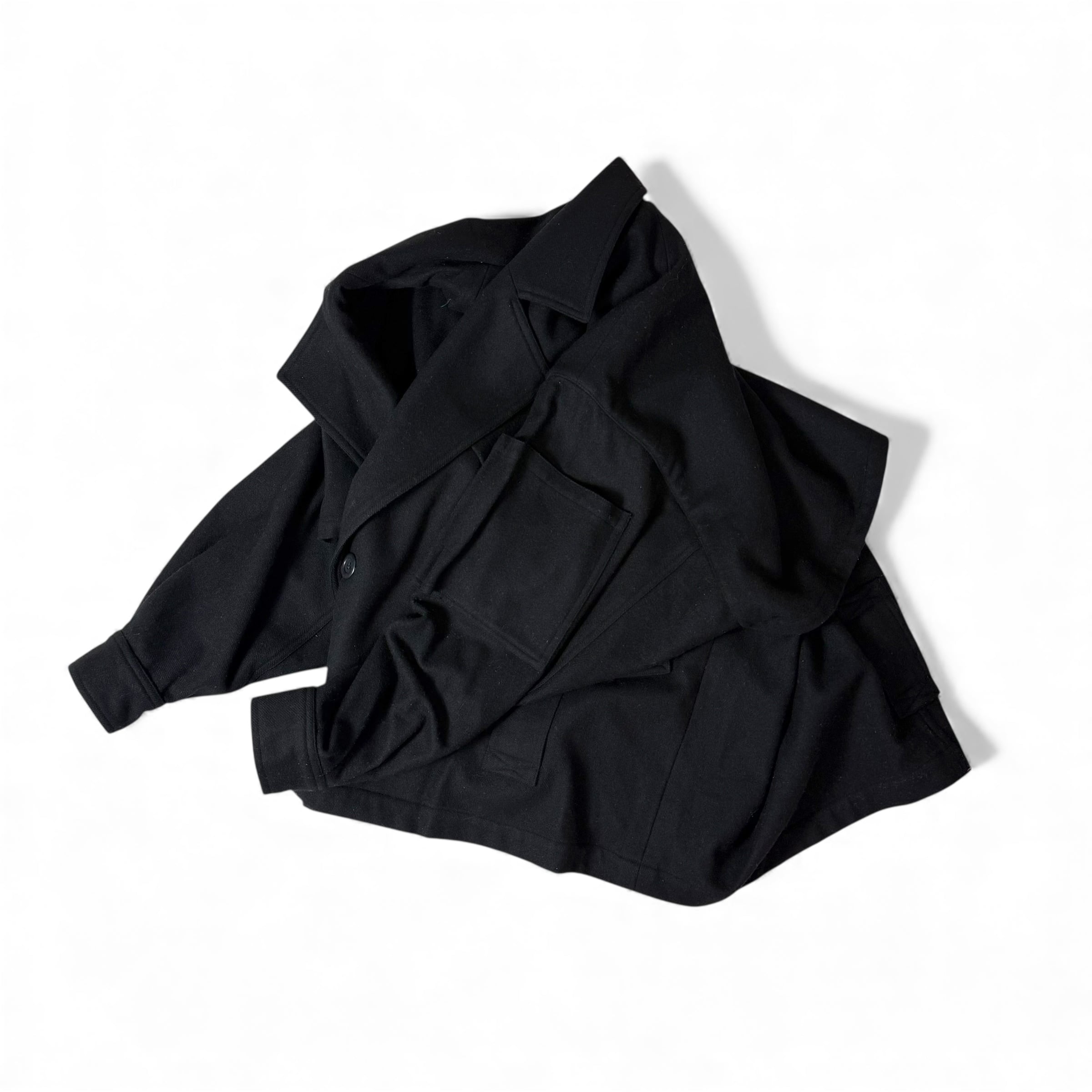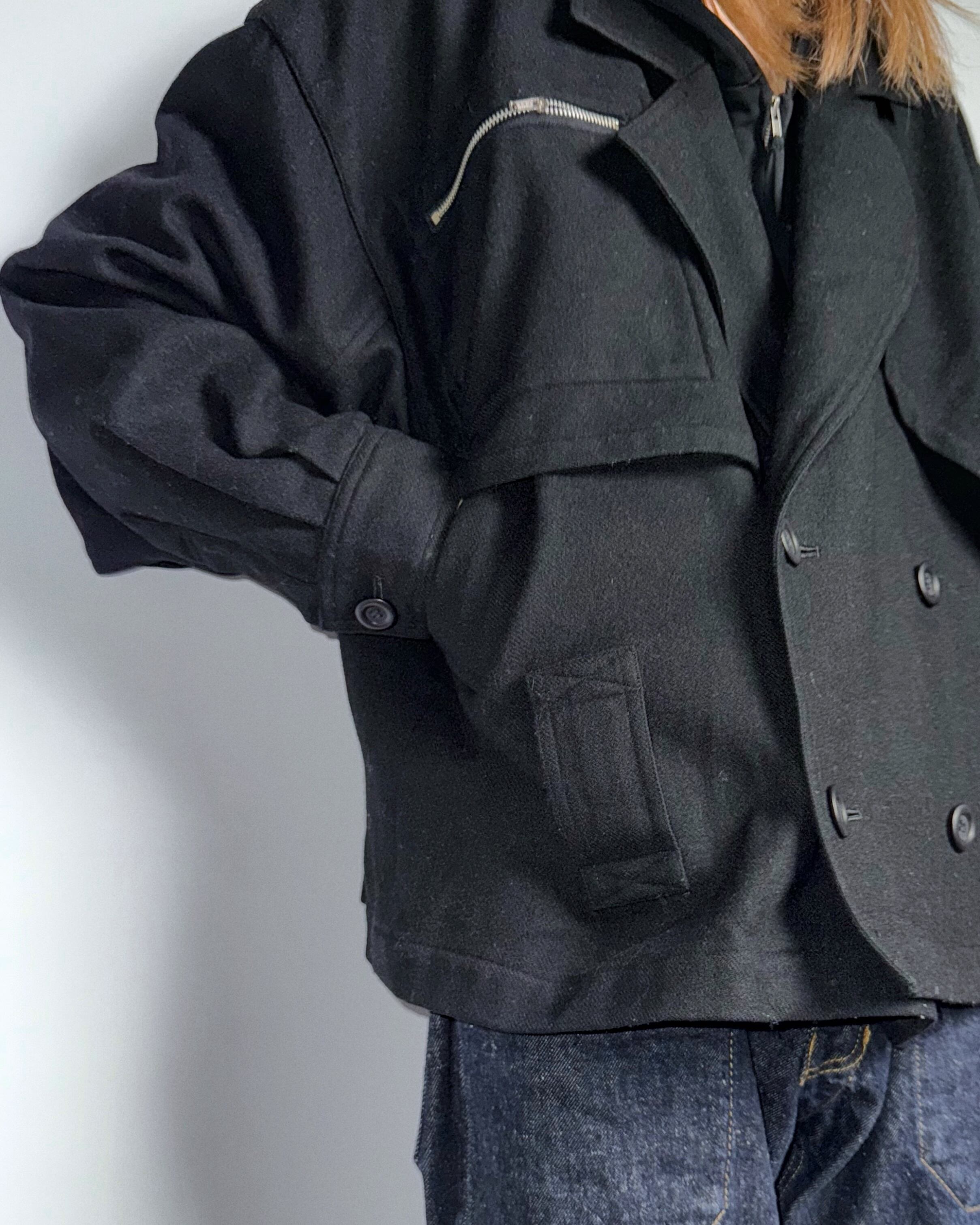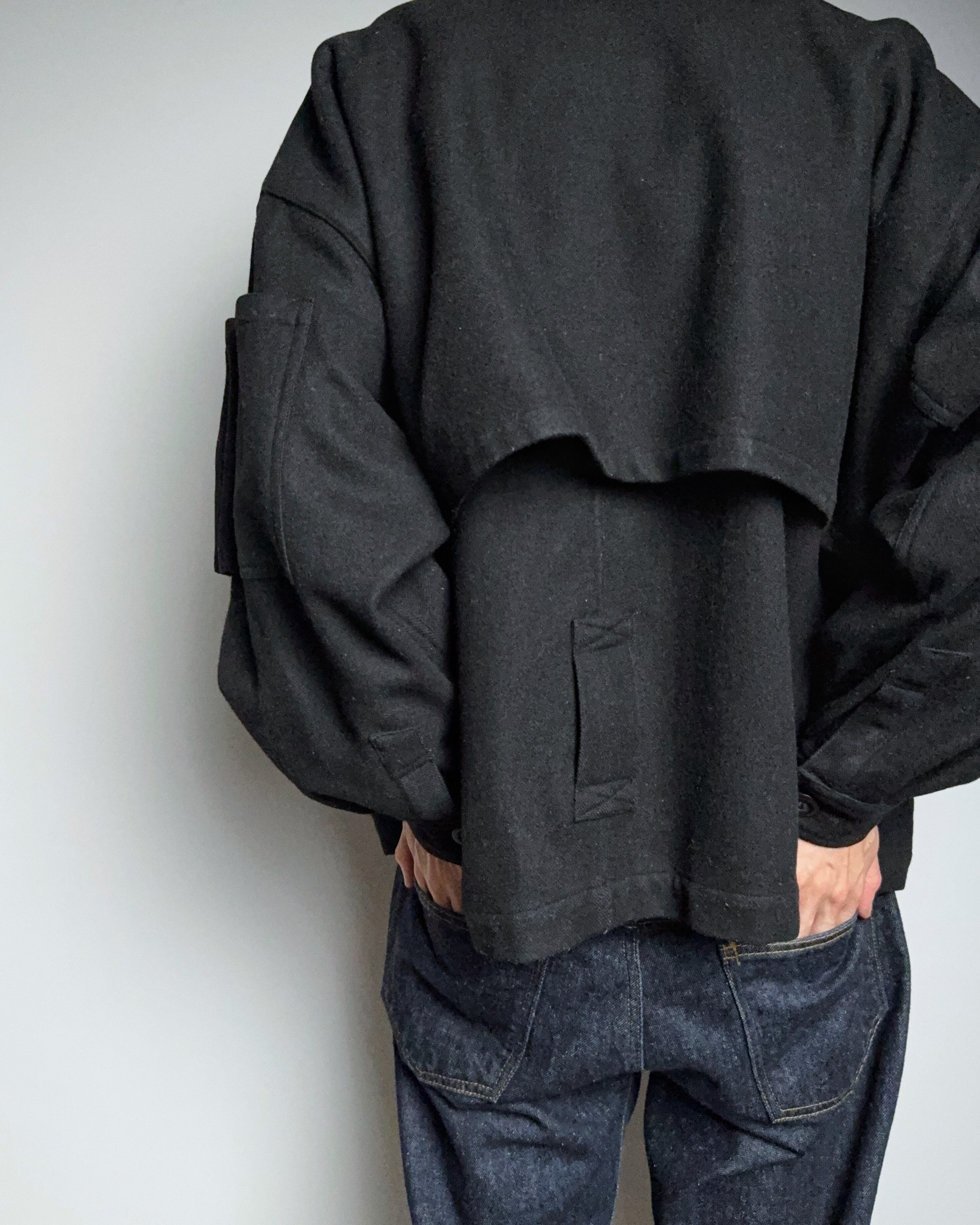 黒でものっぺりせず、立体的に見えるウールショートジャケット。