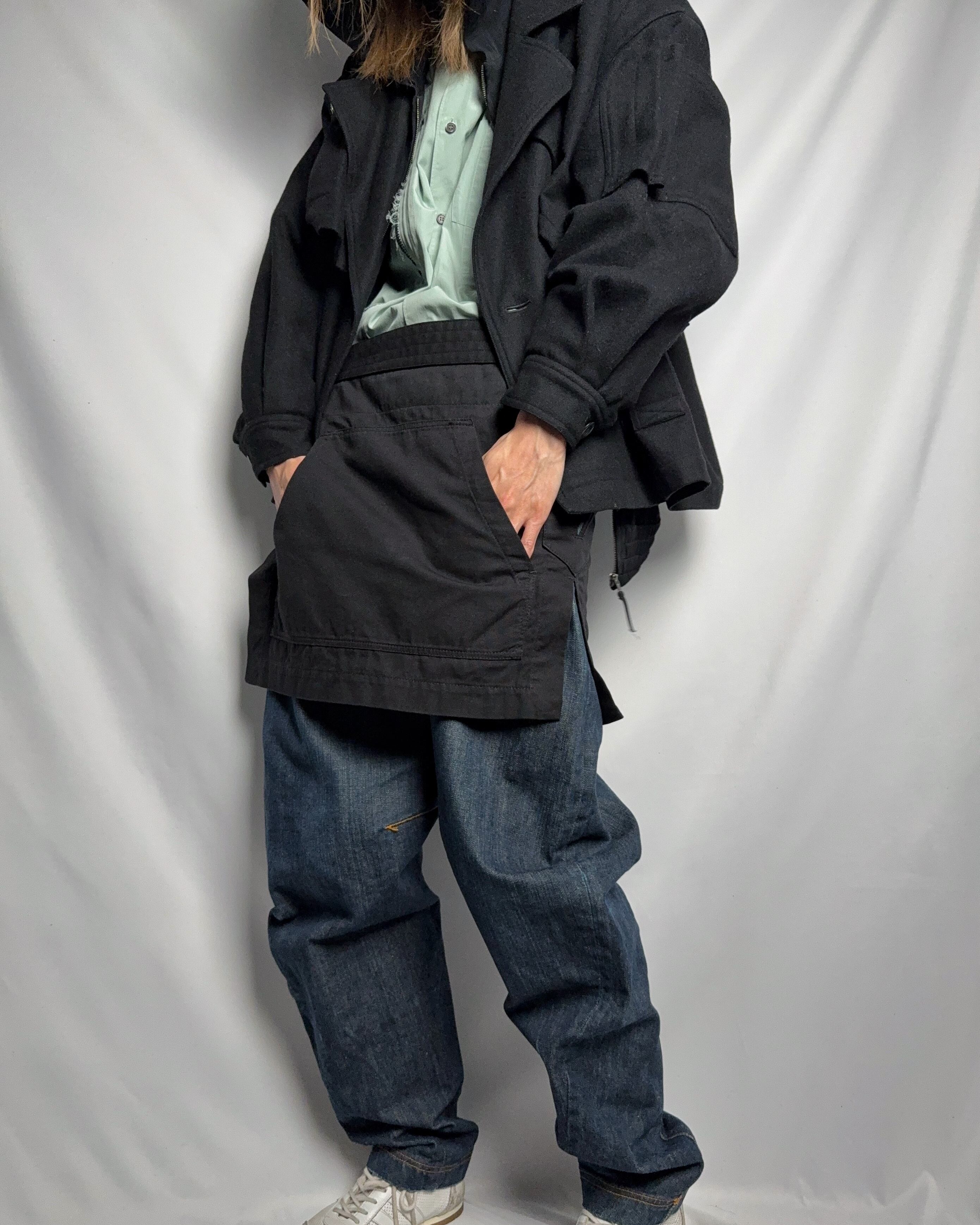 ショート丈のジャケットに、大きな布を一段重ねたデザイン。
