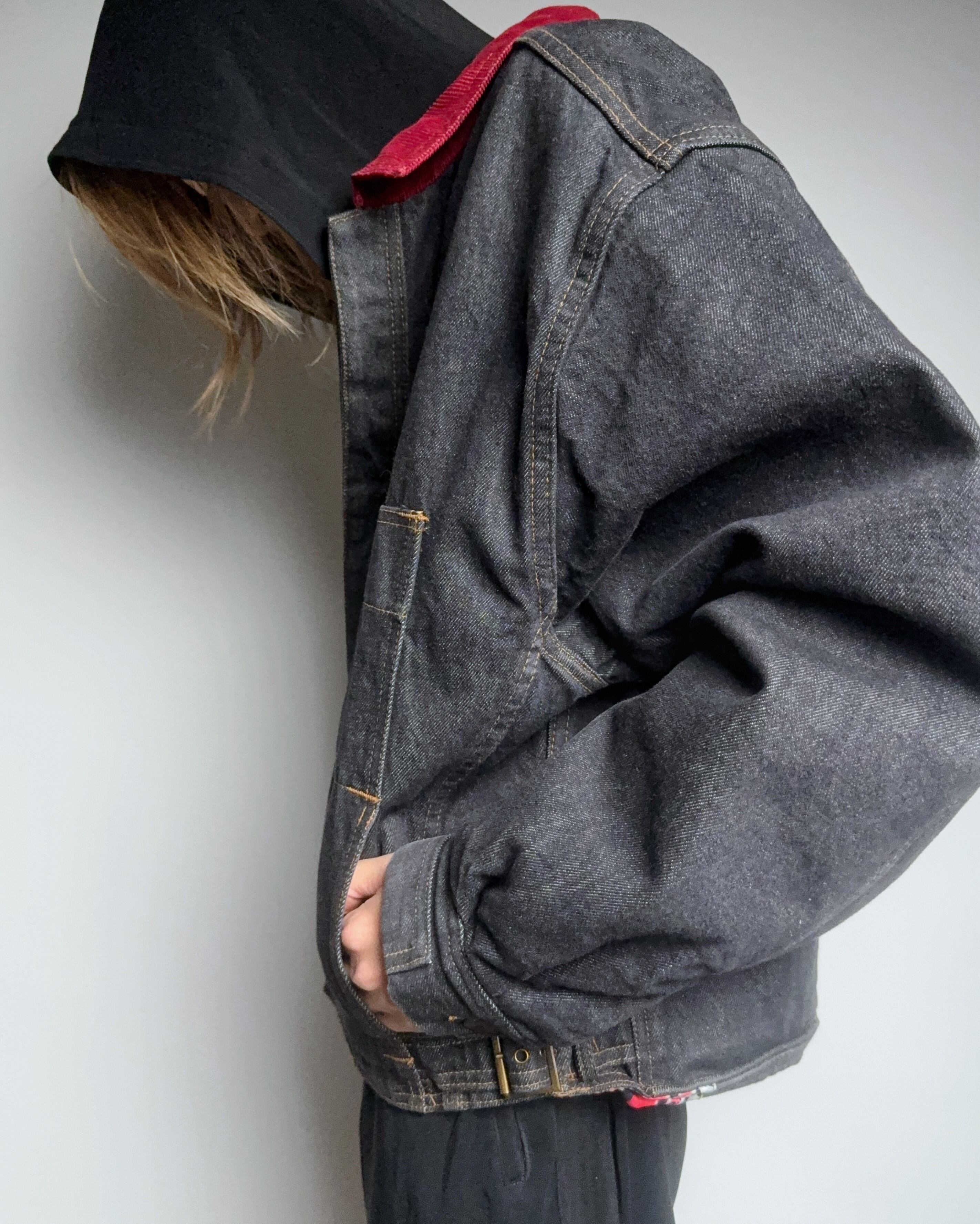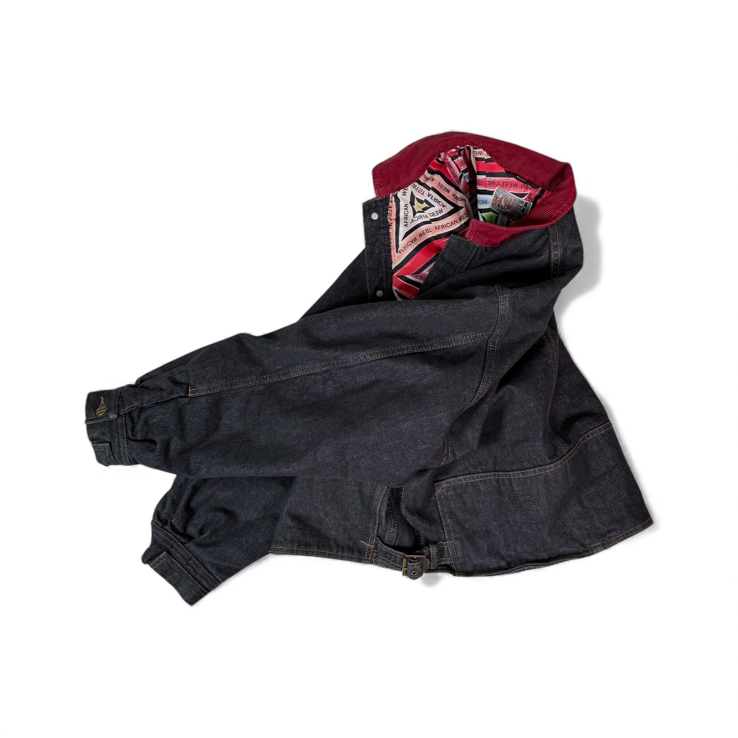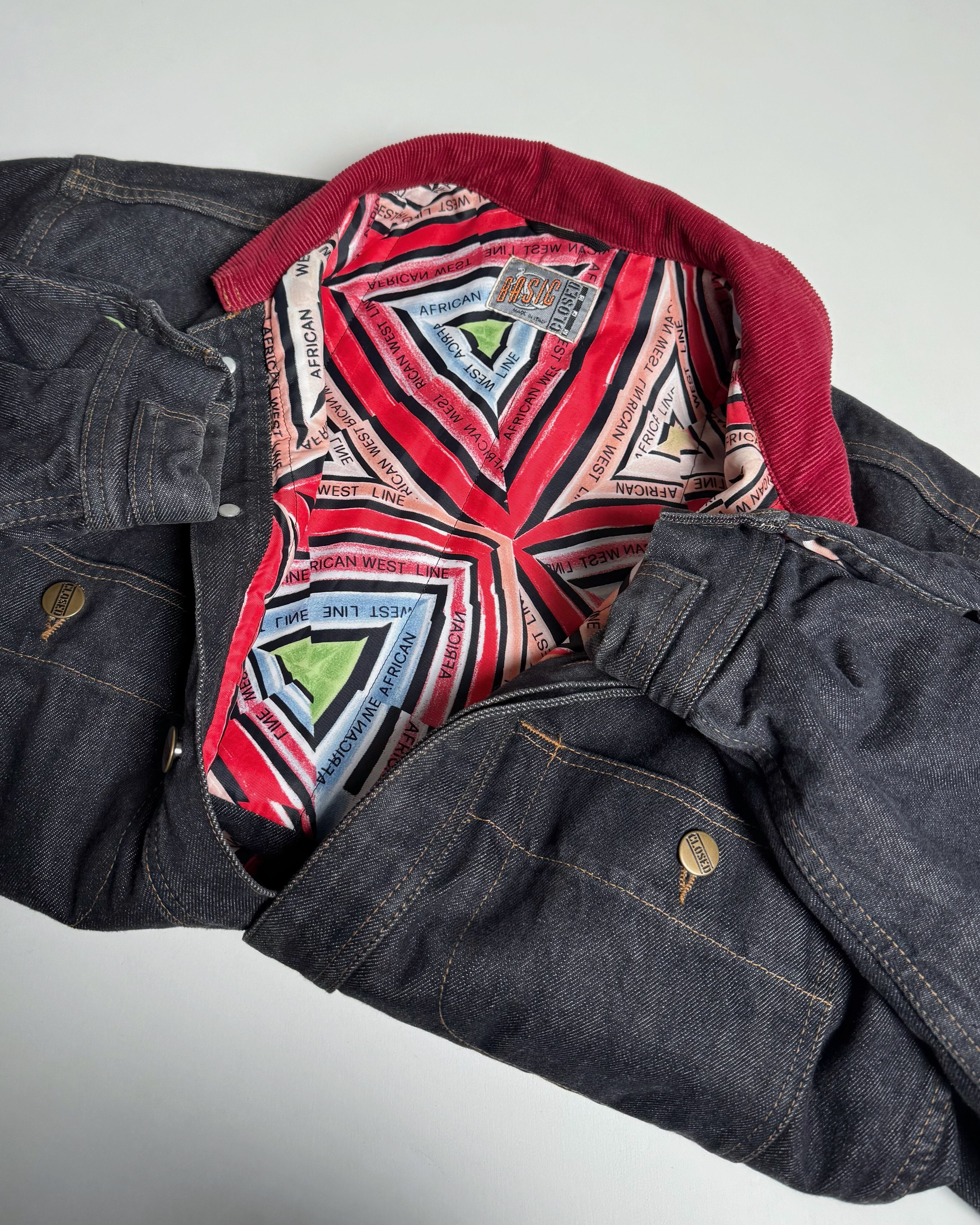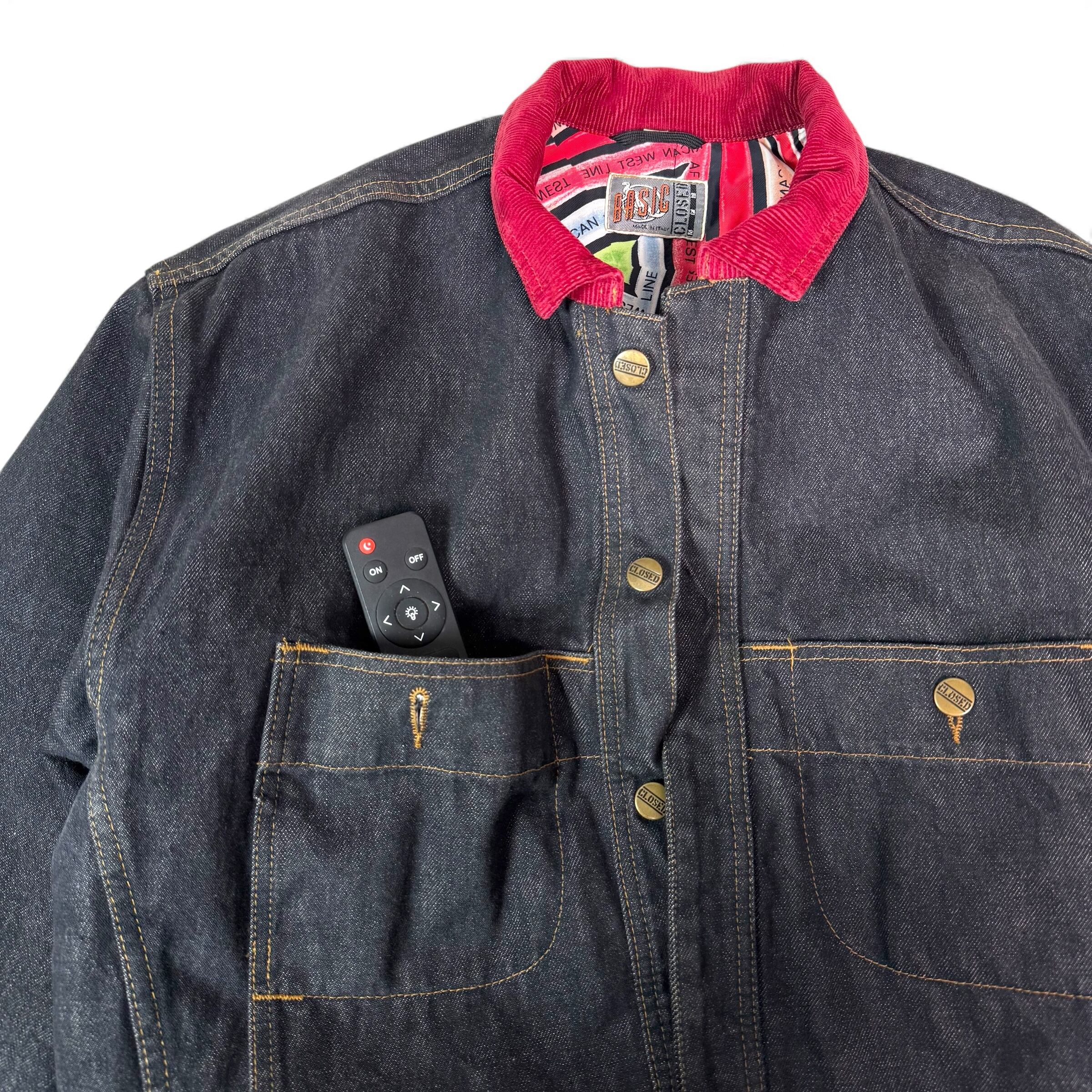 濃いインディゴに、赤いコーデュロイ襟が一点だけ強く効いていて、