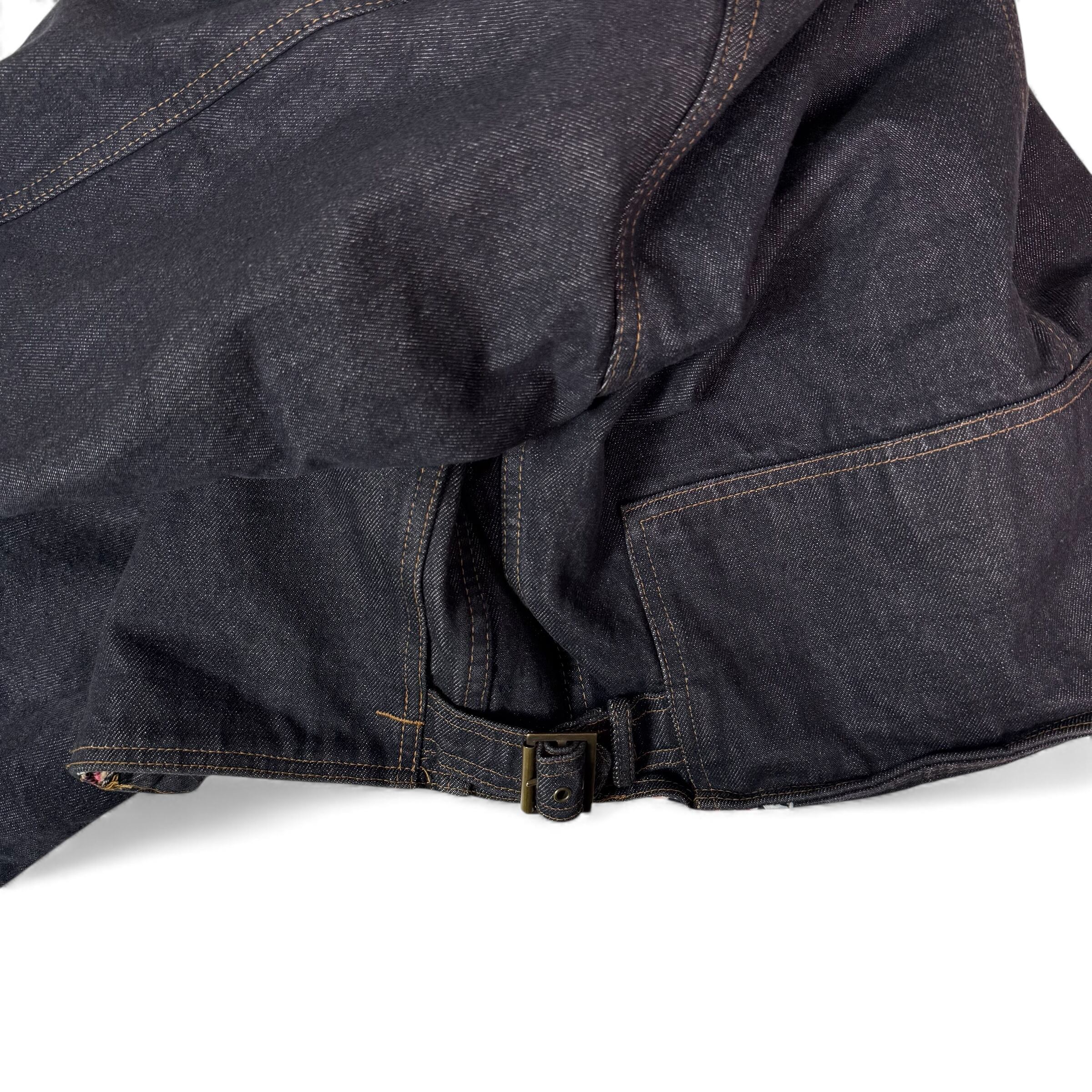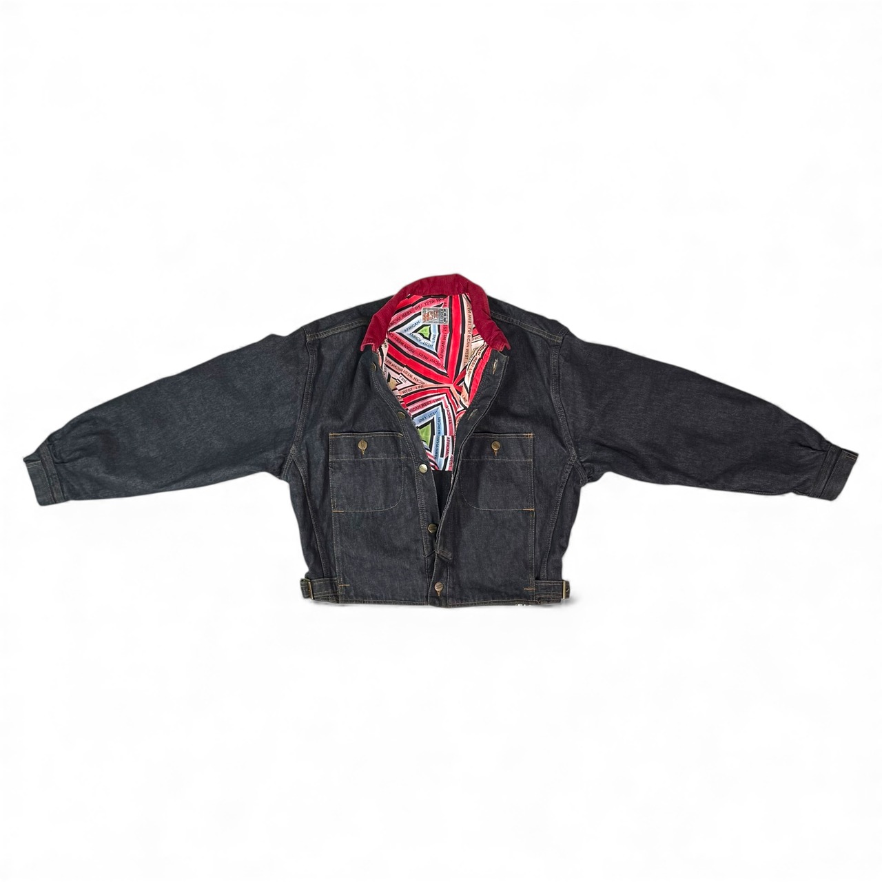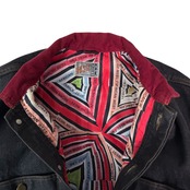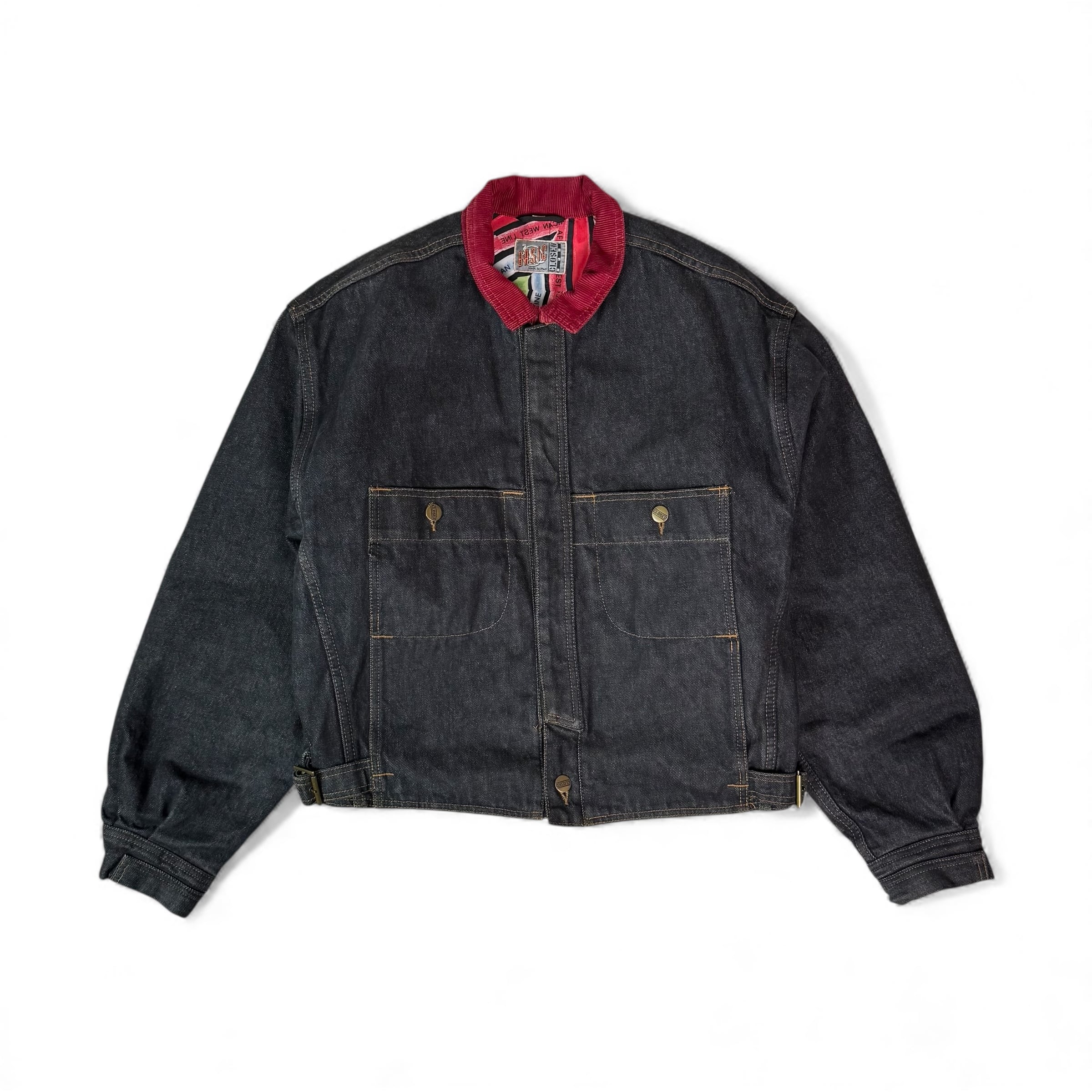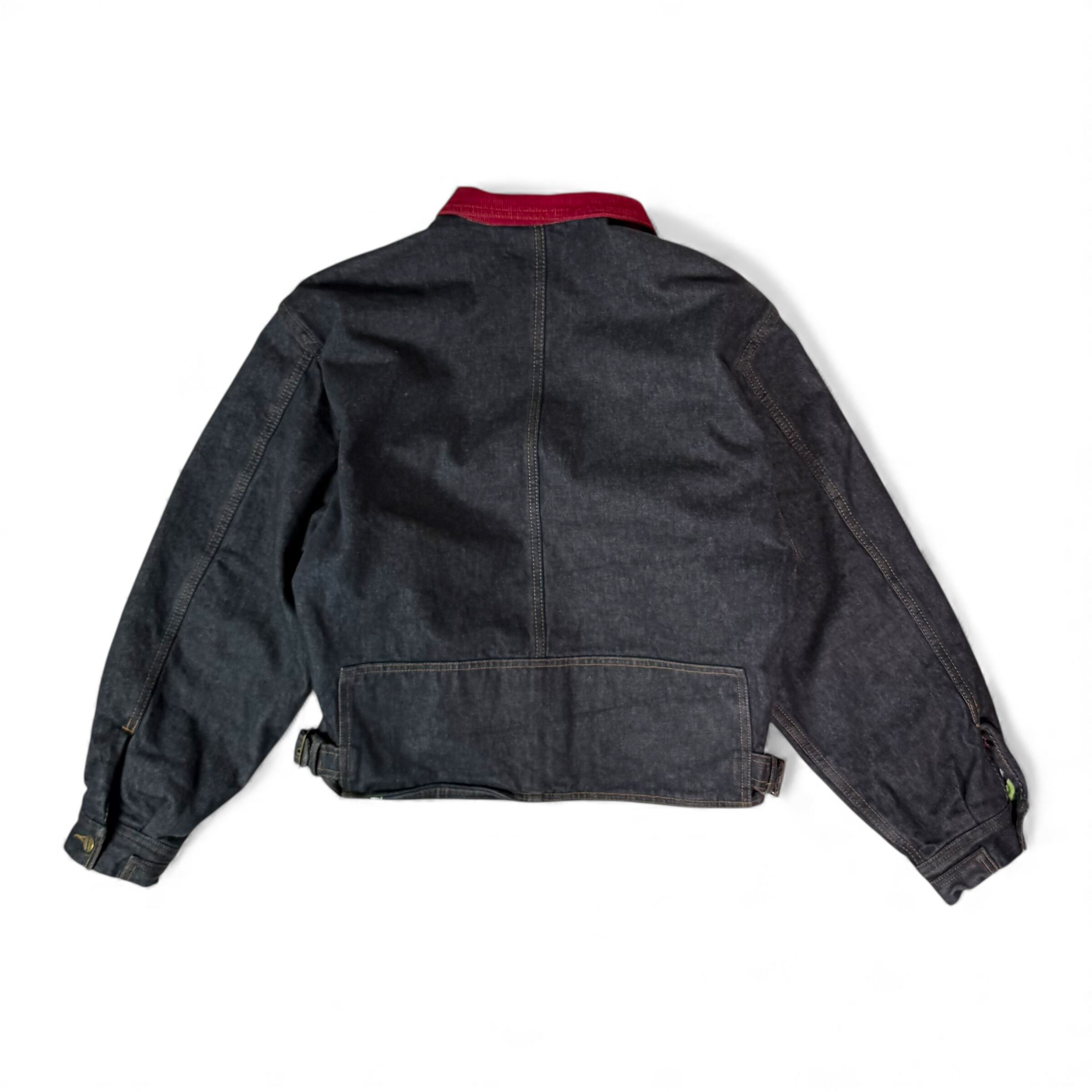 濃いインディゴに、赤いコーデュロイ襟が一点だけ強く効いていて、