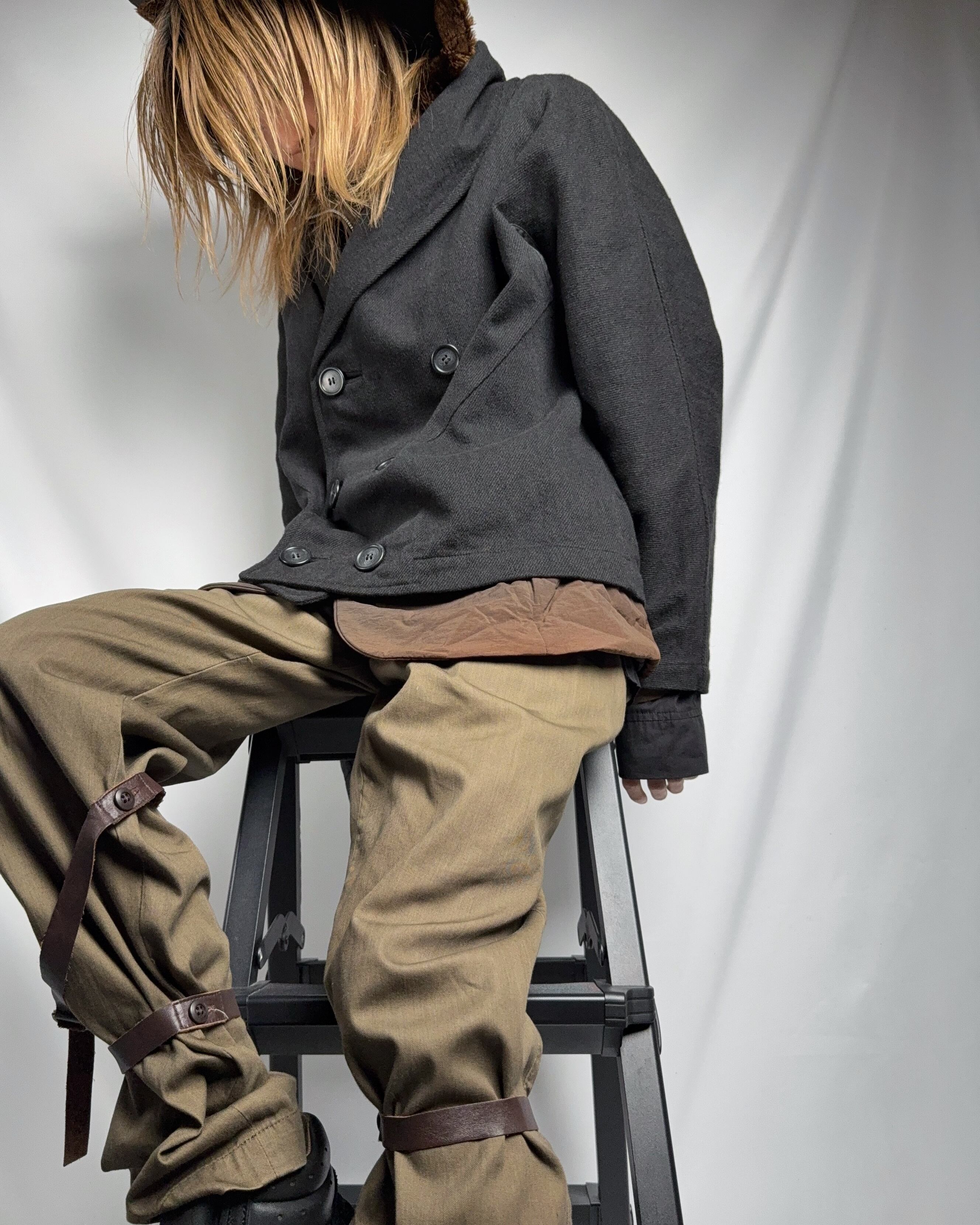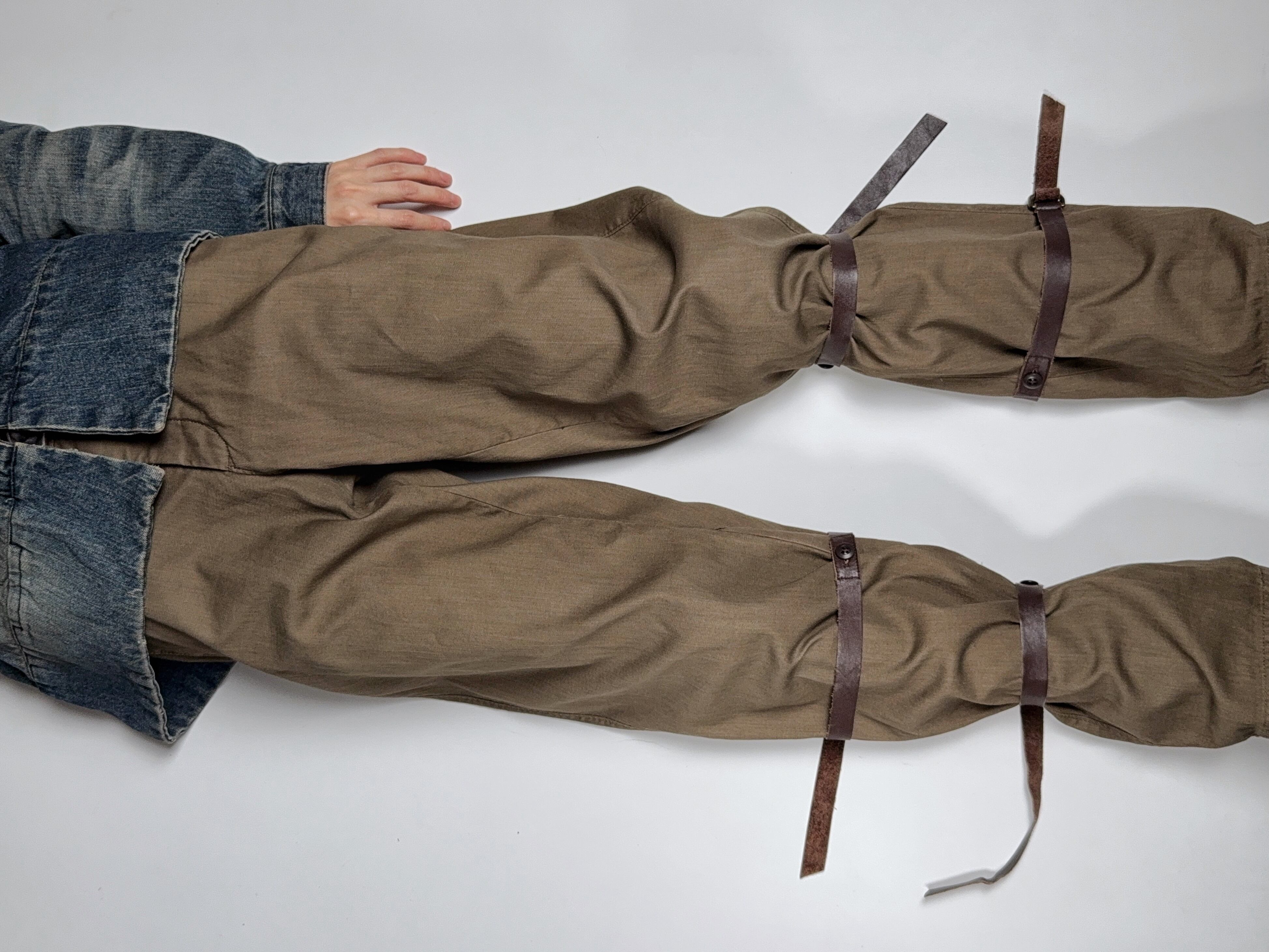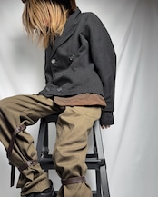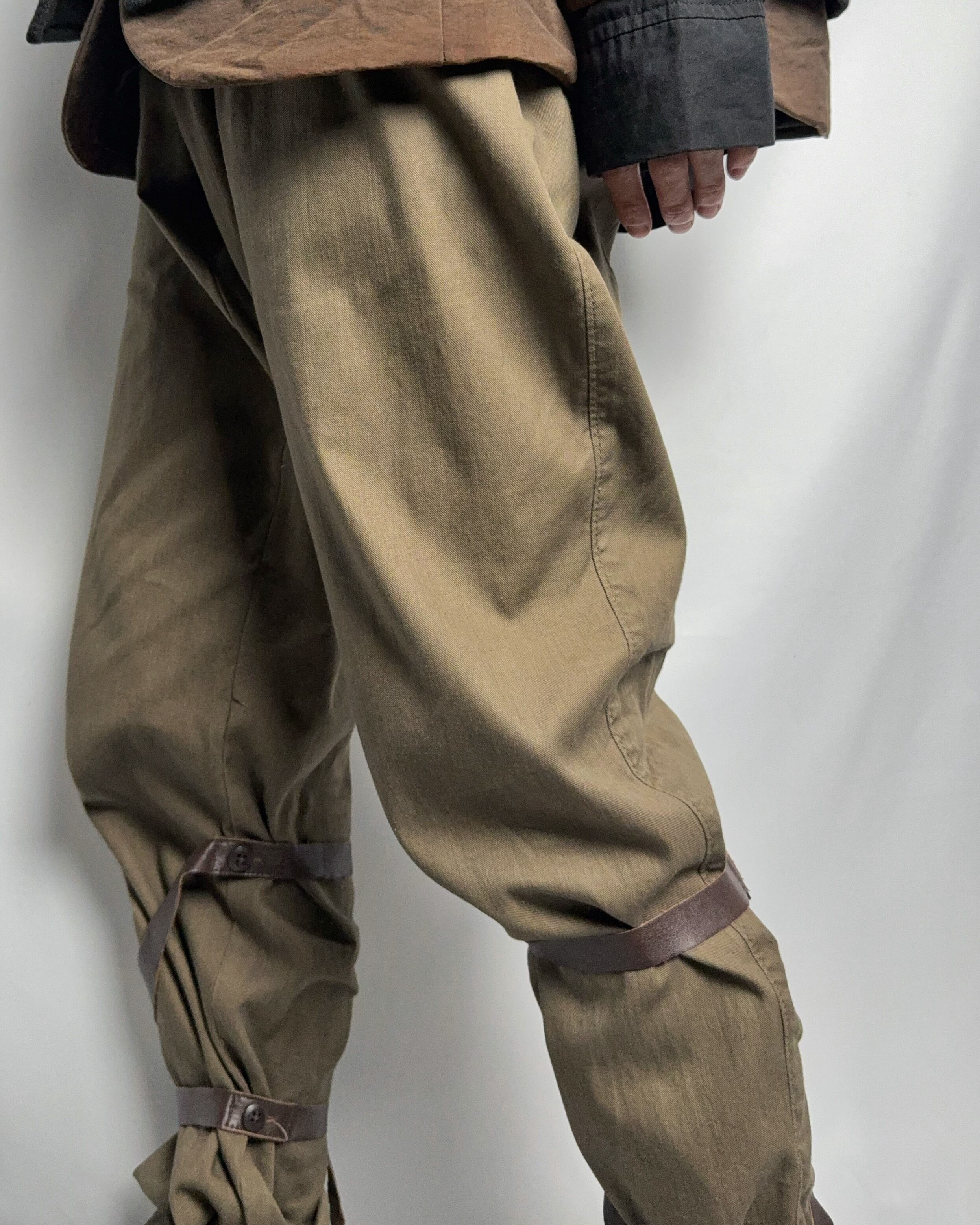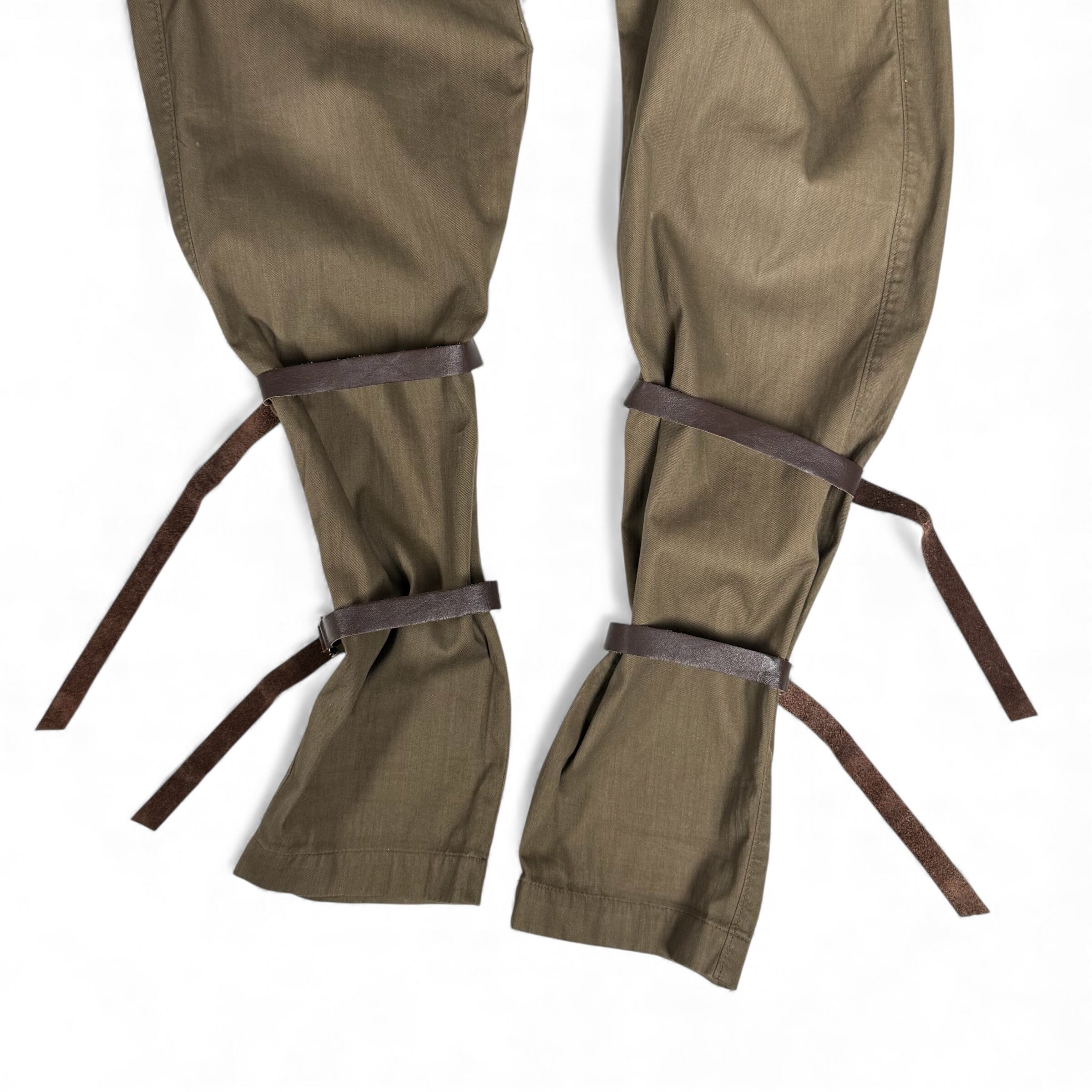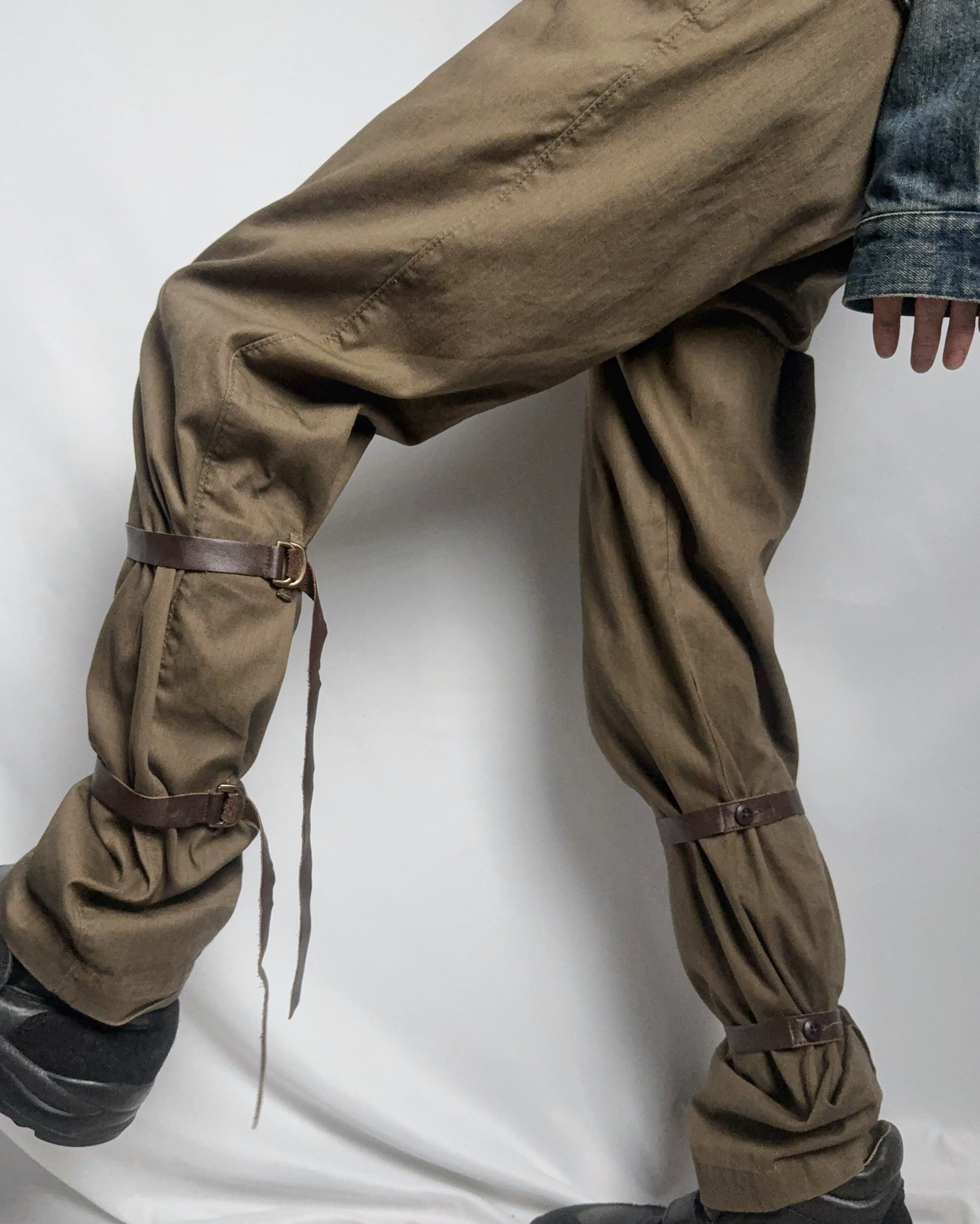 削ぎ落としたボトムスにレザーストラップを巻き付けたパンツ。