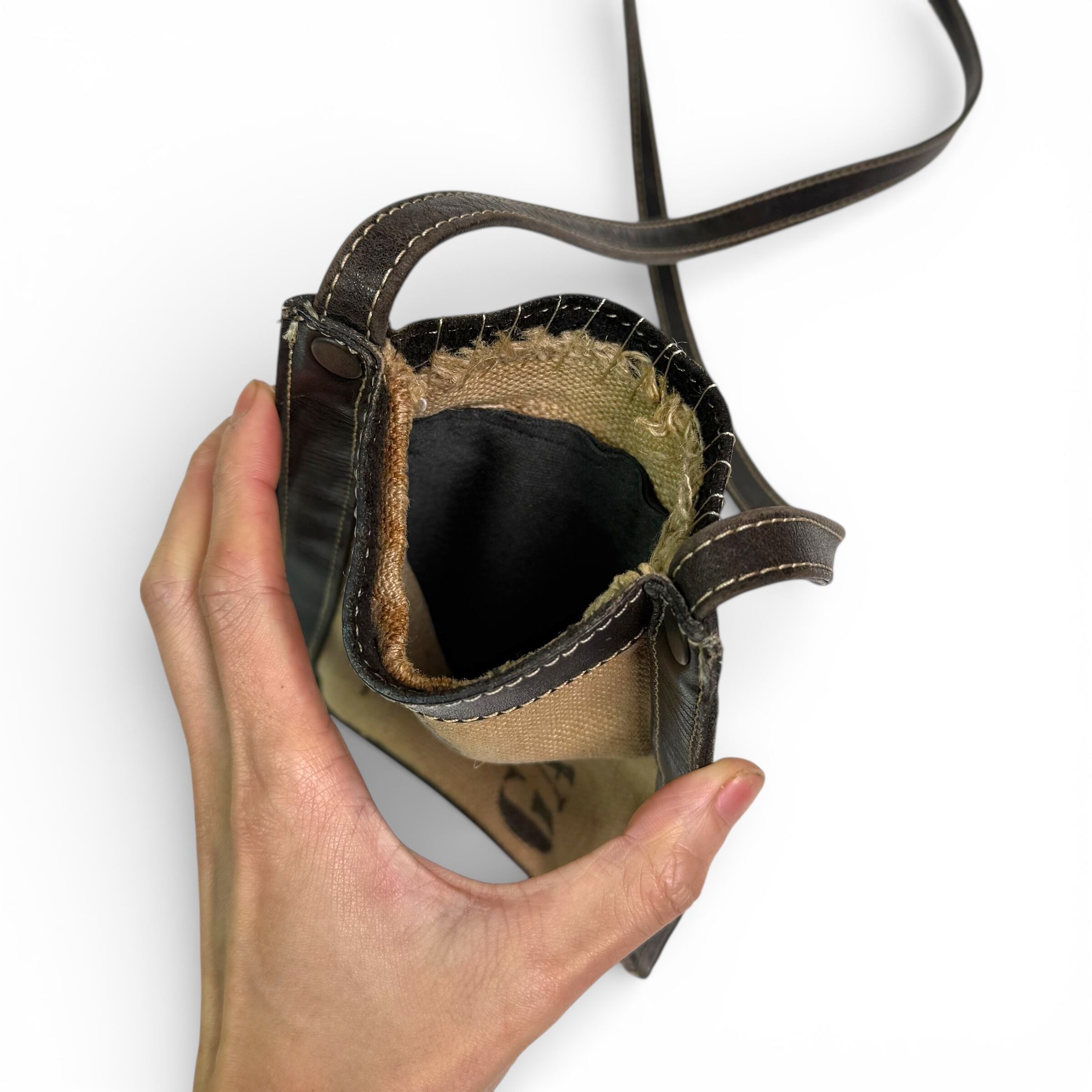本体は厚みのあるキャンバス地をベースに、縁とストラップ部分にはレザーを使用。