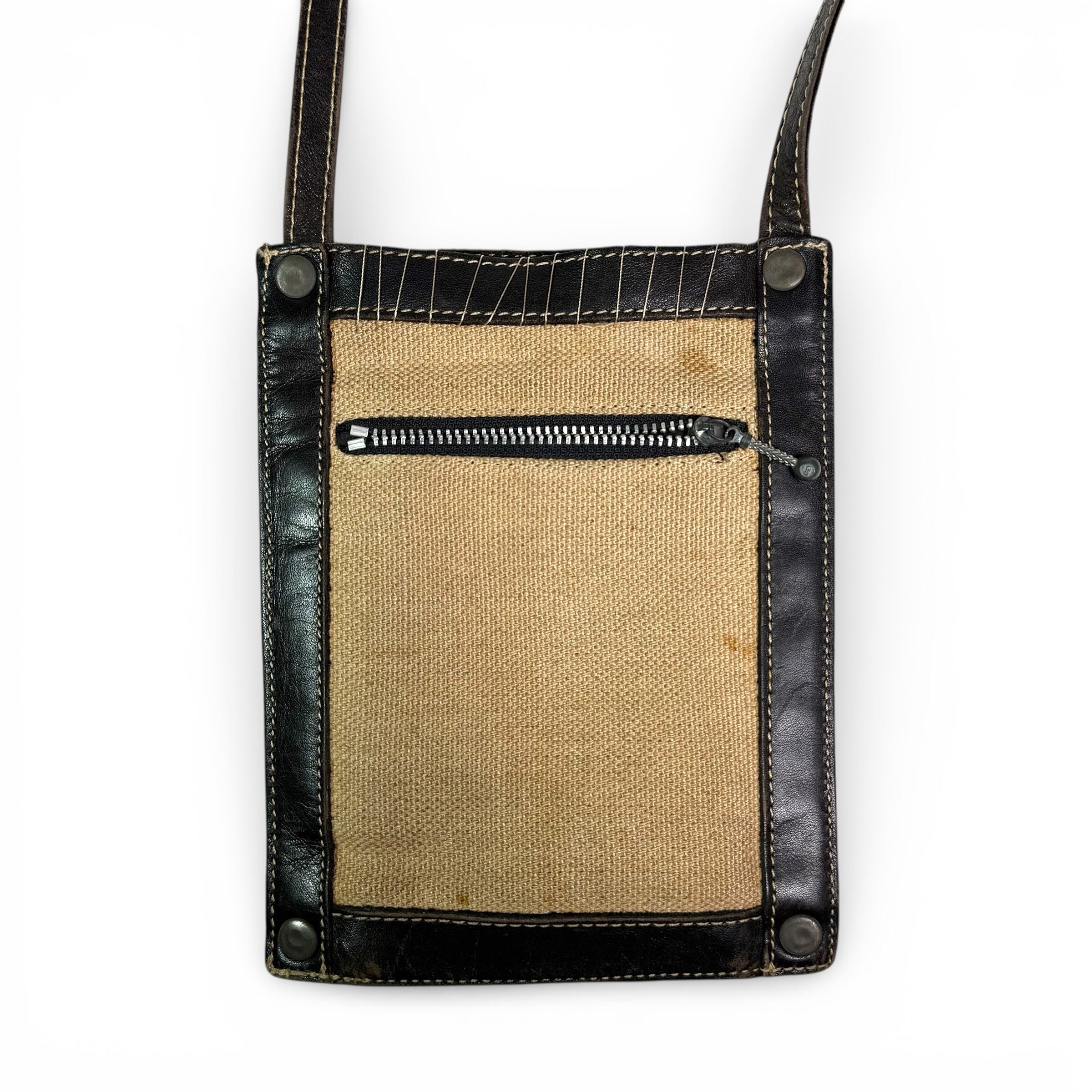 キャンバス特有のラフさと、レザーが全体を引き締めており、ゴルチエらしい“街とモードの間”を体現したアイテム。