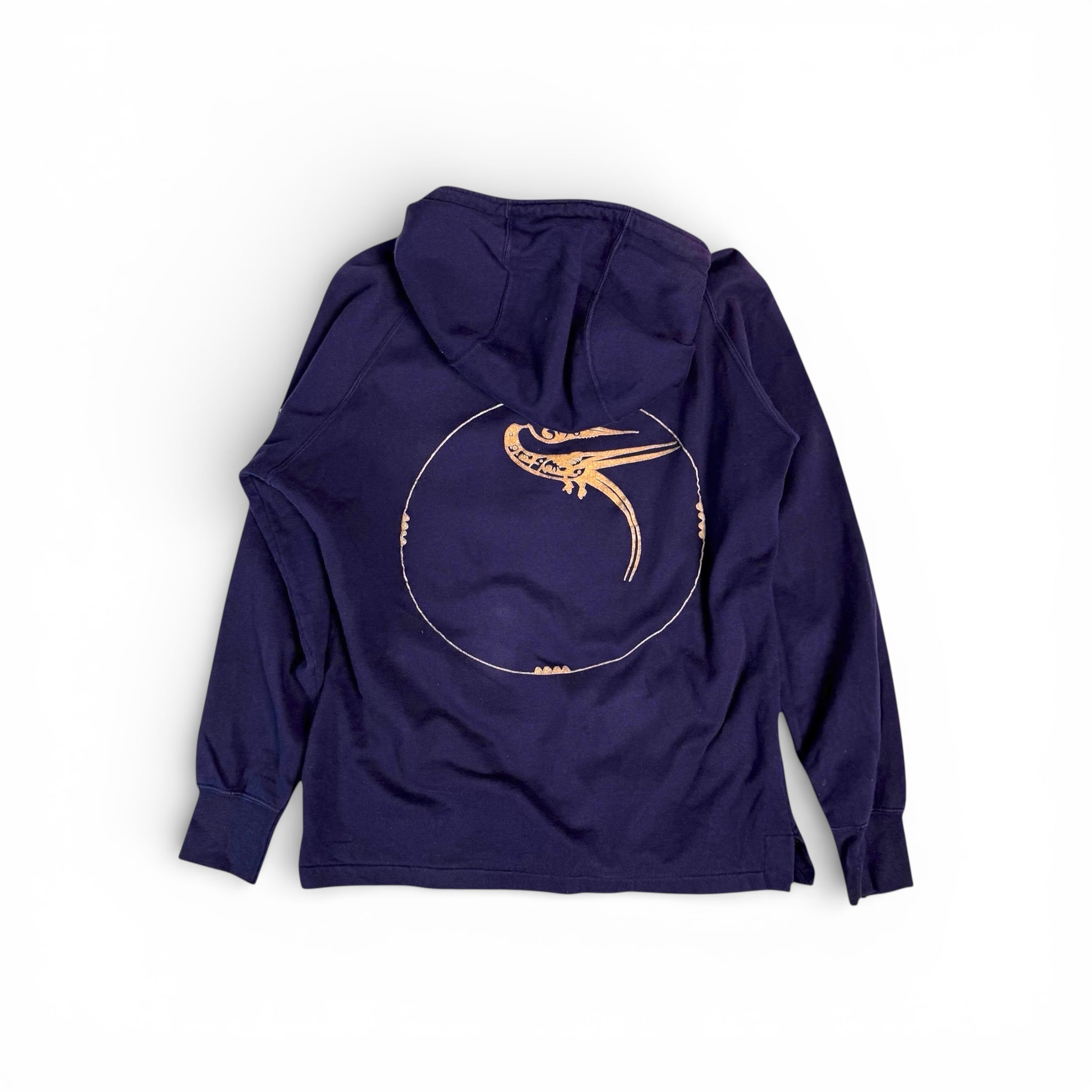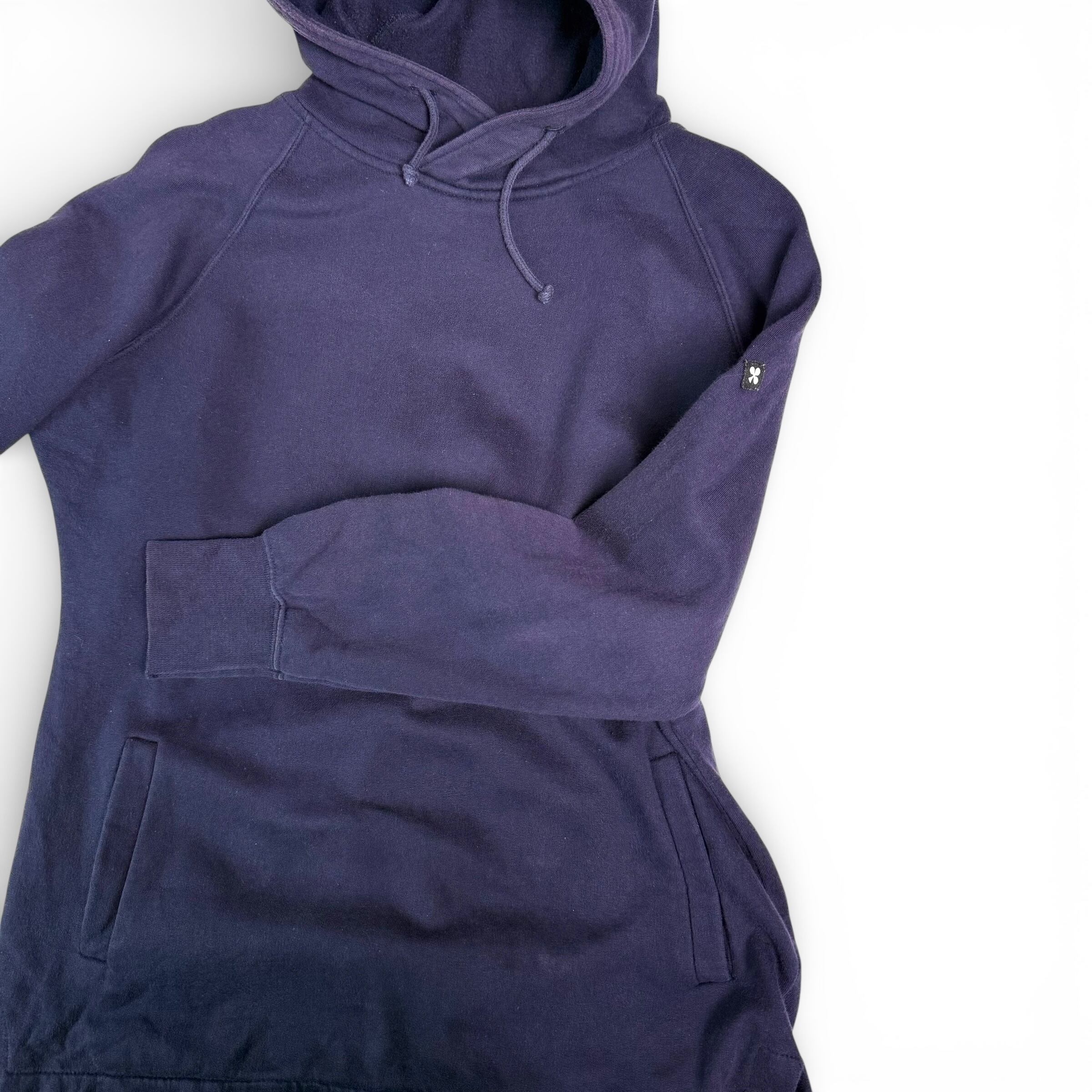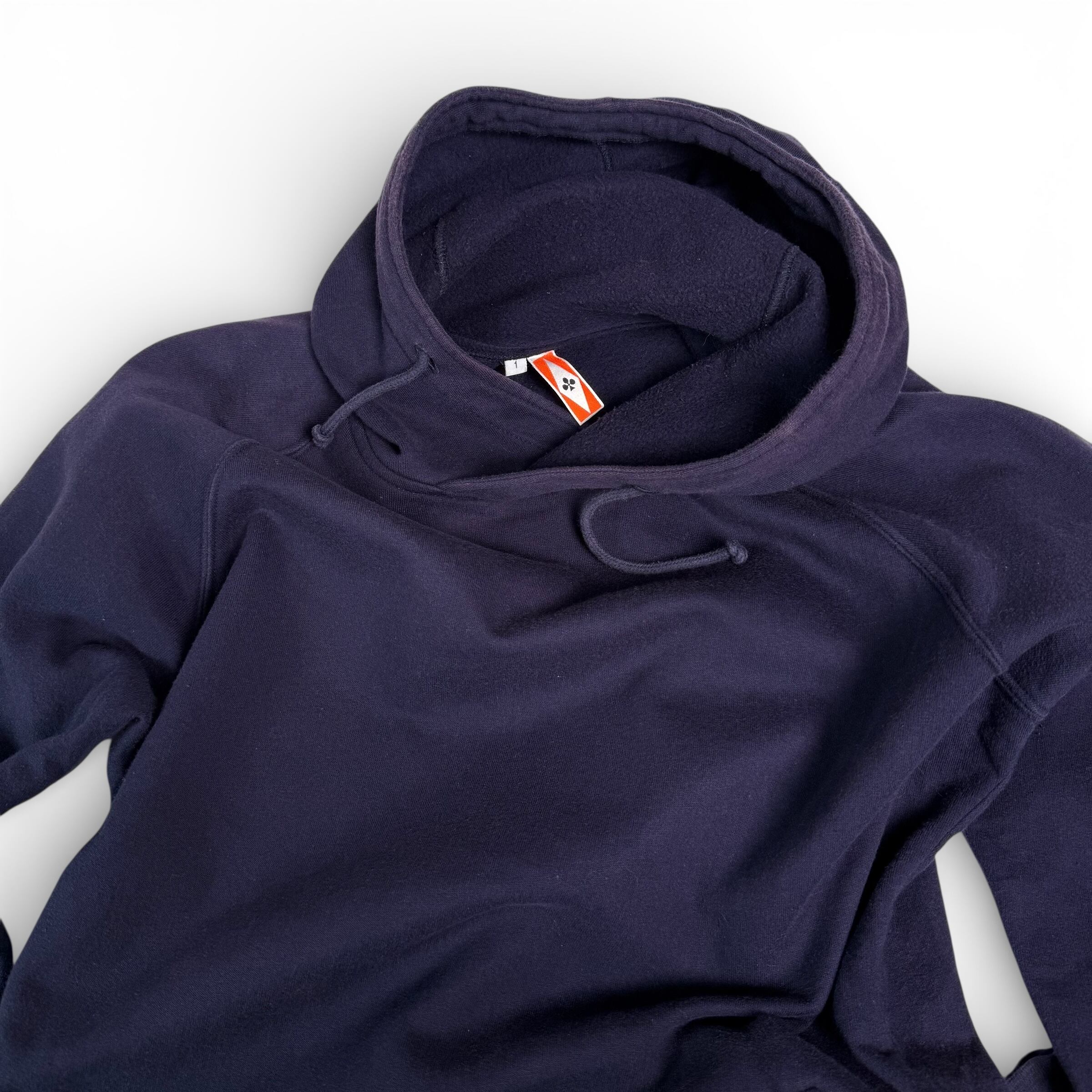 襟のように重なったカラー、少し小ぶりなフード。忍者のような匿名性を持ったフーディー。