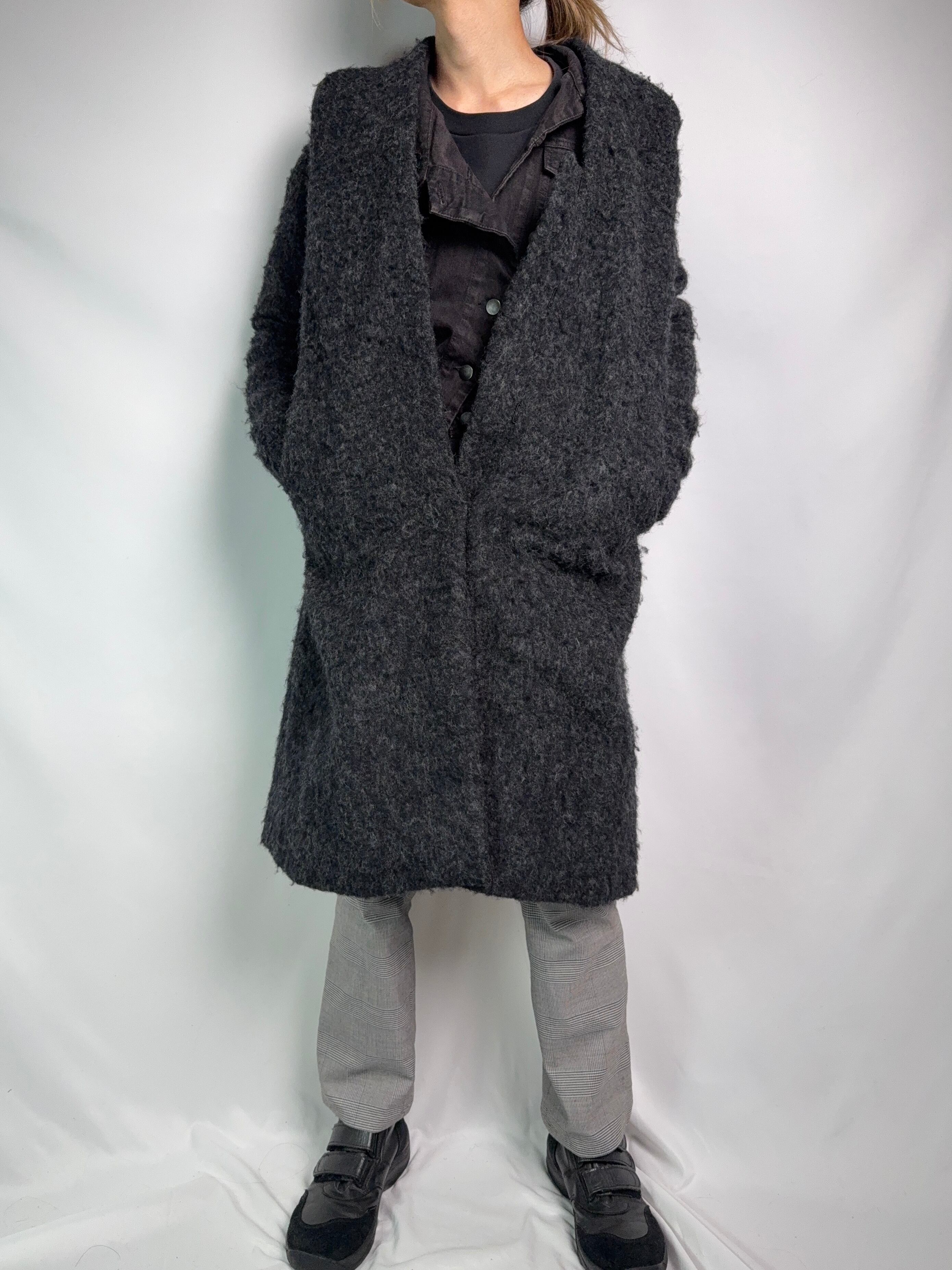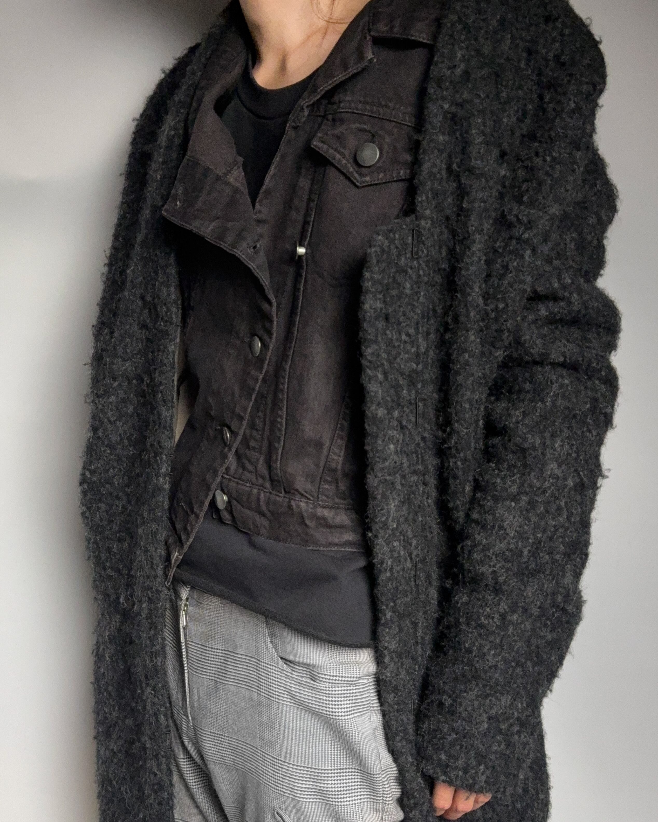 右部分にボリュームをもたせることも、正規のボタンに沿って、テーラードジャケットのように開いた着方も。