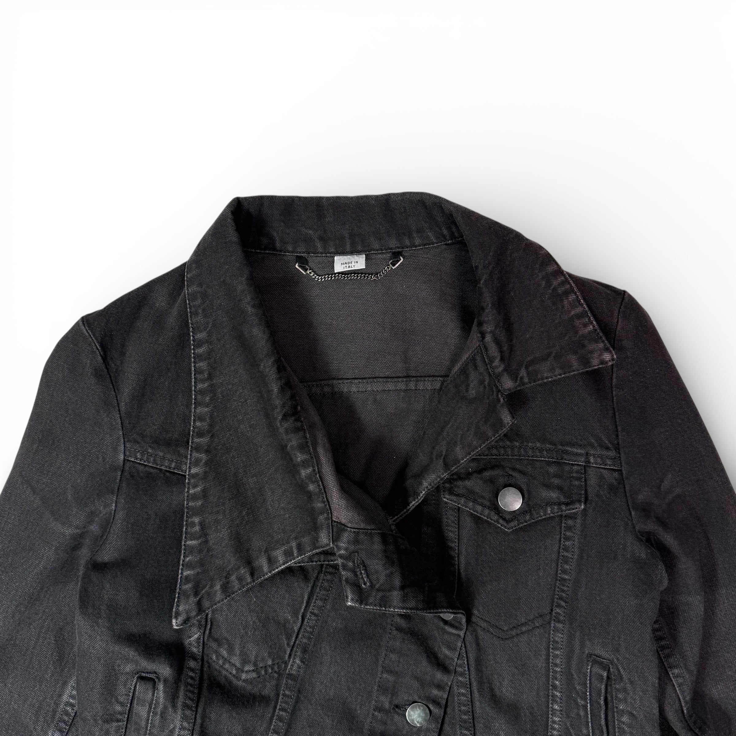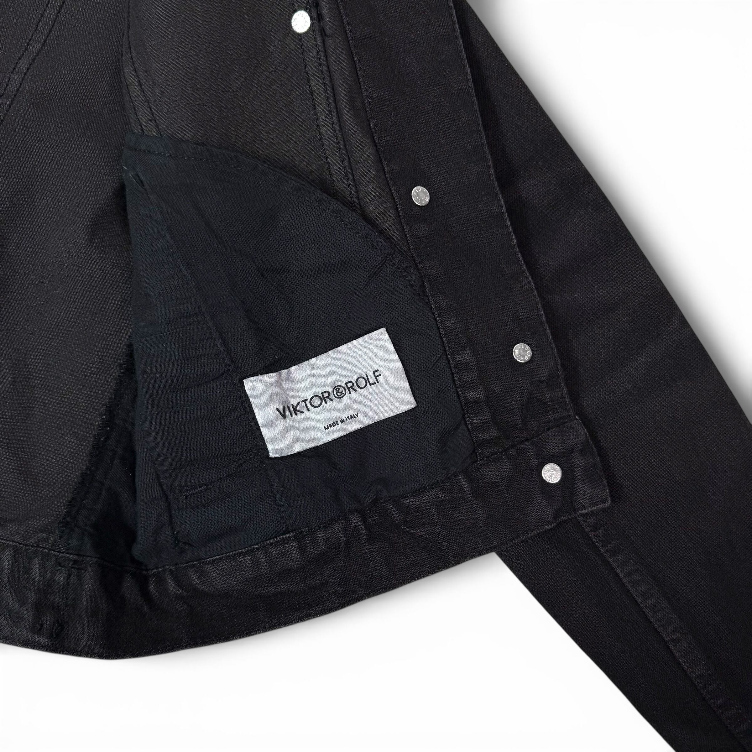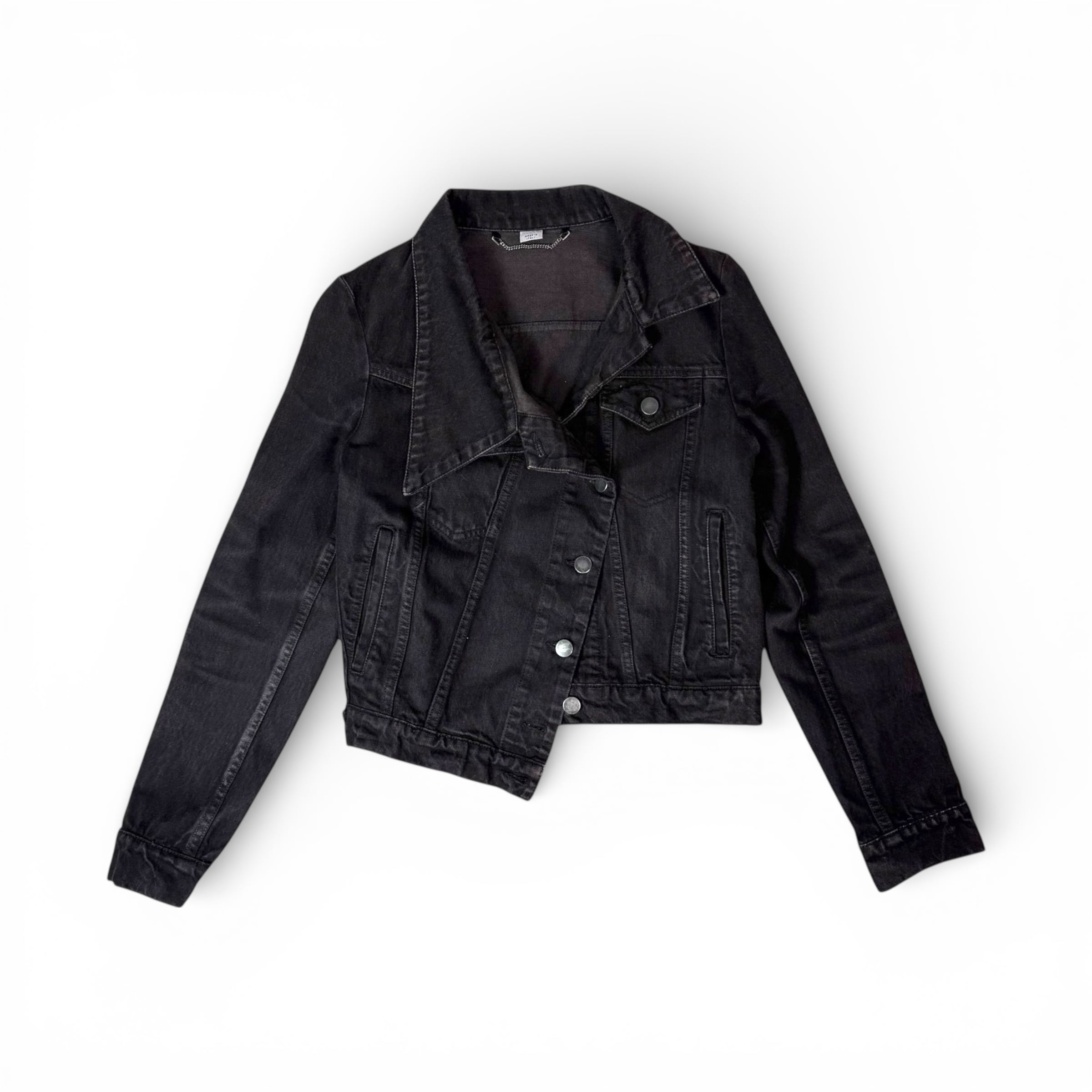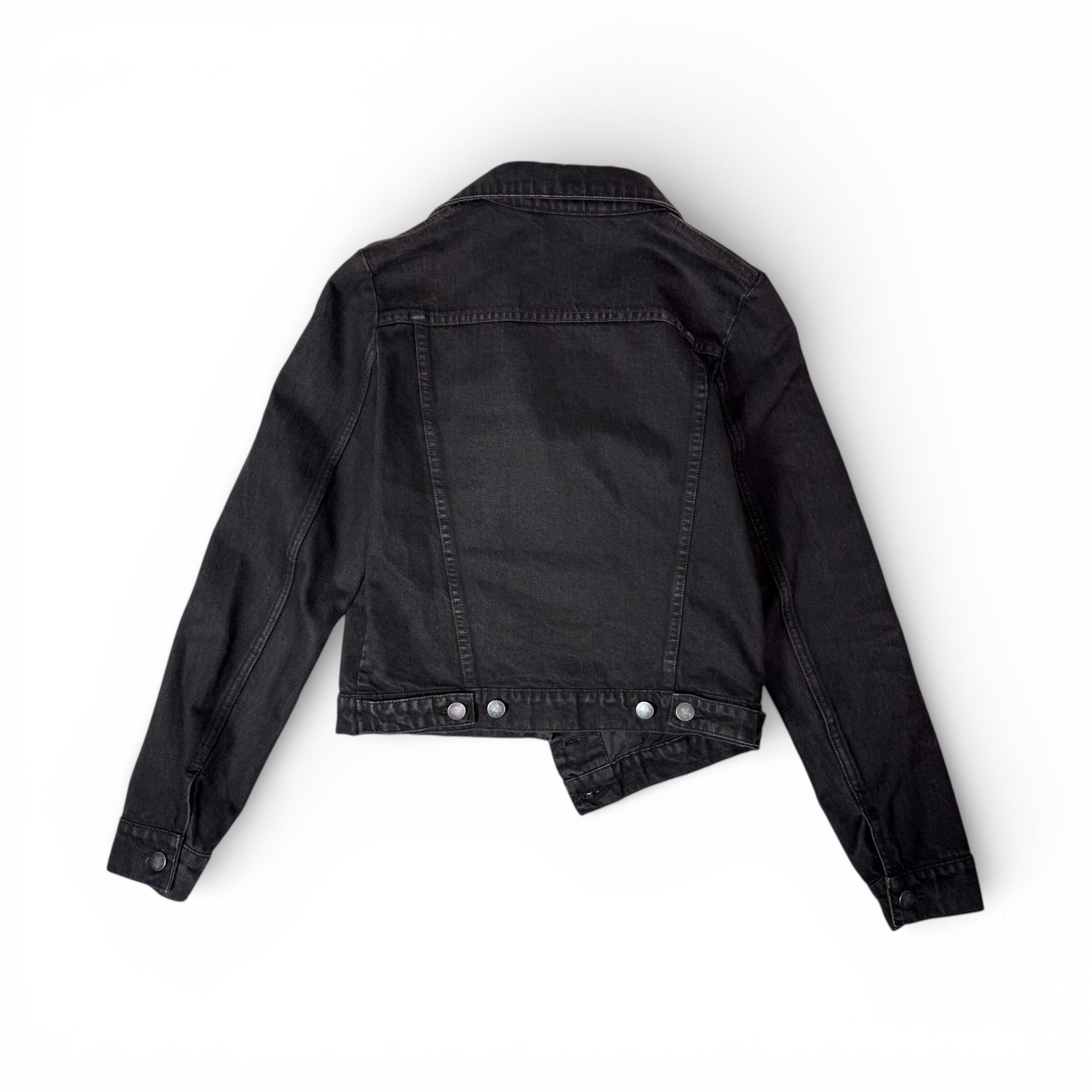 アシンメトリーにカッティングされたデニムトラッカージャケット。